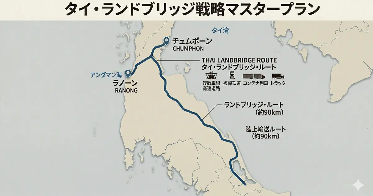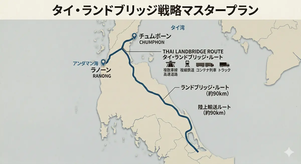 また、タイ南部を横断する「ランドブリッジ・プロジェクト」(チュムポーン県〜ラノーン県間を道路・鉄道で結ぶ構想)の推進により、マラッカ海峡を迂回する新たな物流ルートを確立し、東南アジアのハブとしての地位を強固にする方針だ。