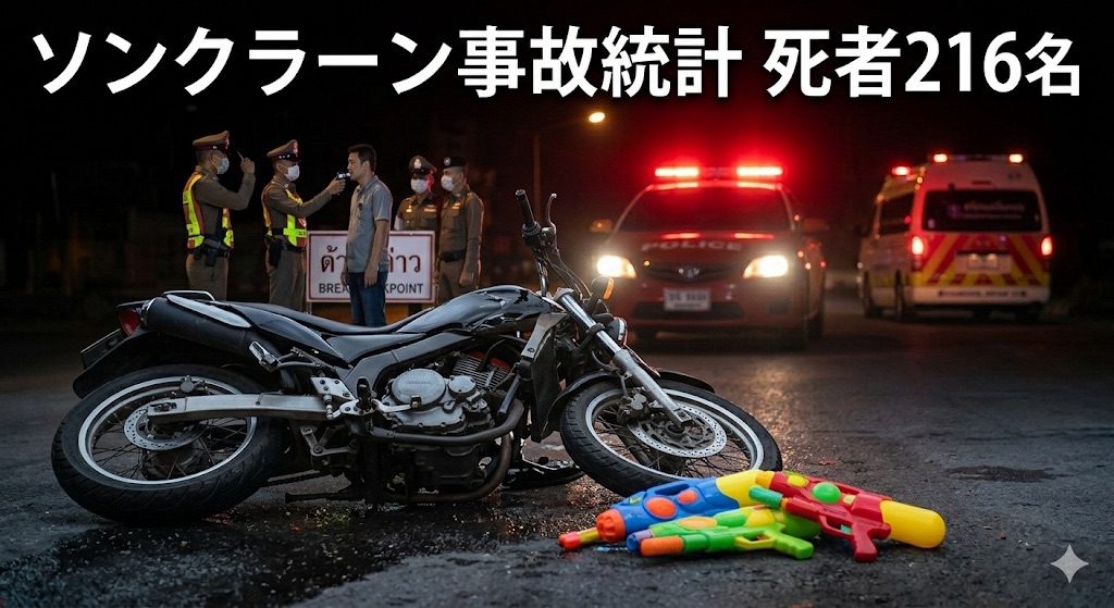 タイ内務省が16日に発表した「危険な7日間(4月10〜16日)」の道路交通事故統計(第6日目終了時点)によると、累計事故件数は1,108件、死者数は216名、負傷者数は1,073名となった。前年同期比では事故件数が約20%、死者数が6.5%減少したものの、依然として深刻な状況が続いている。