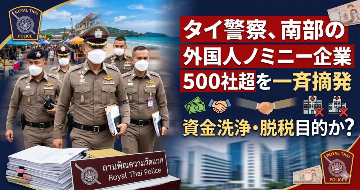 ノミニー企業とは、外国人が直接企業を経営することを禁じるタイの法律を回避するため、名義上はタイ人を株主・代表とし、実質的に外国人が経営する違法な手法のことだ。当局によると、今回摘発された500社超は不法就労・脱税・資金洗浄などに活用されていた可能性が高い。