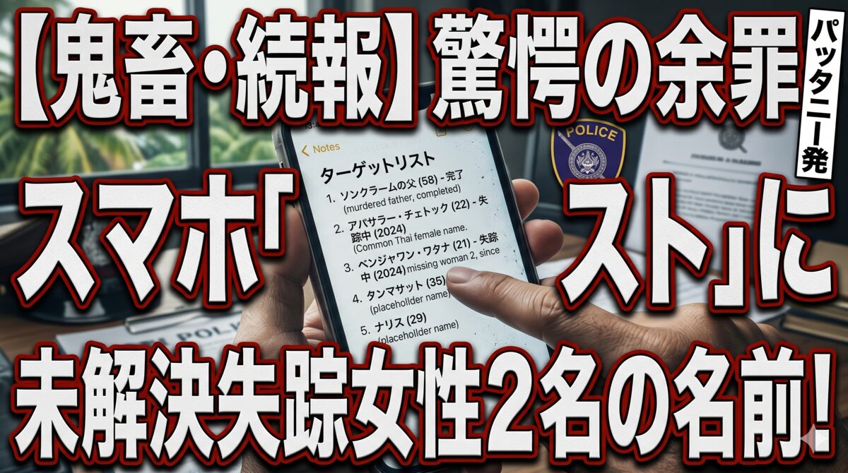 【パッタニー発】「微笑みの国」を恐怖のどん底に突き落とした鬼畜の凶行に、戦慄の新事実だ。4月15日に重要証人の父親(58)を射殺した容疑者の男(32)から押収されたスマホ内の「ターゲットリスト」を解析した結果、そこには殺害された父親以外にも計5名の名前が記されていたことが判明。うち2名は、2024年から行方が分からなくなっている地元の若い女性であることが分かり、警察当局は「連続拉致監禁・殺人」の疑いで捜査を拡大。タイ全土で「悪魔に情けをかけるな」と、去勢刑導入を求めるデモが激化している。